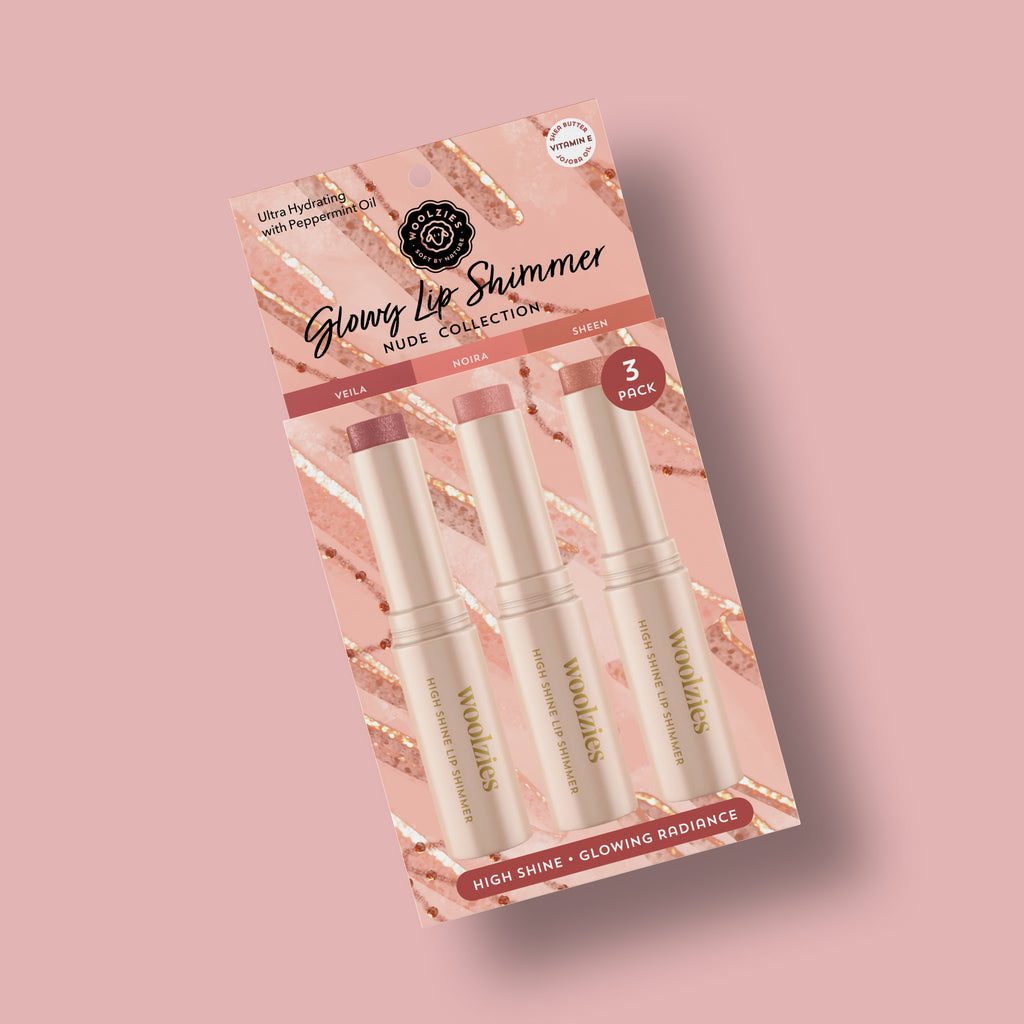 Meet your new must-have glow. The Woolzies Glowy Lip Shimmer Trio delivers a luminous wash of color with a silky, moisturizing finish. Each shimmer glides on smoothly with buildable shine, leaving lips soft, glossy, and naturally radiant. Lightweight and buttery, these sticks are perfect for everyday wear — alone or layered over your favorite lip color.